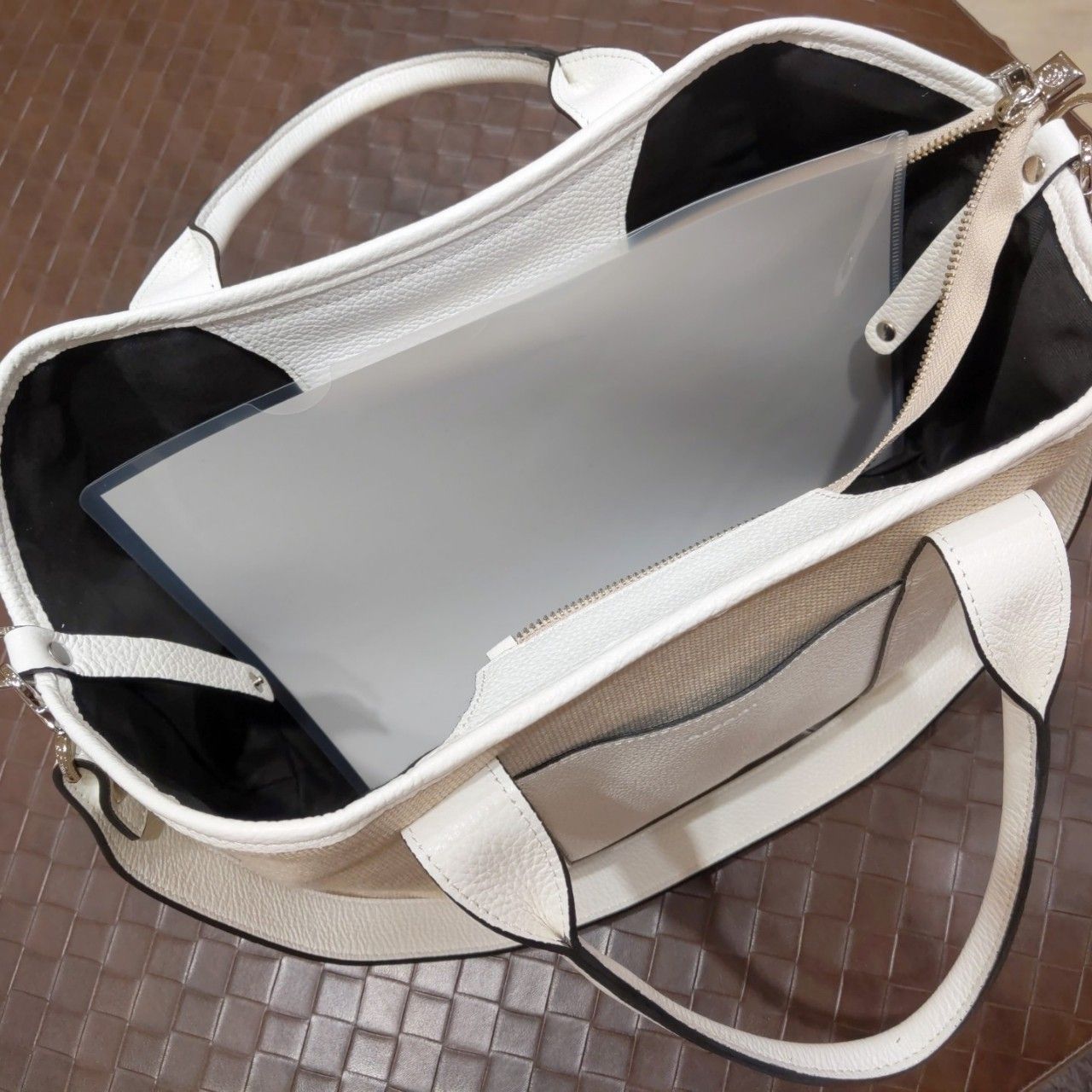 オールレザーよりも軽い印象、オールキャンバスよりもきちんと感が出て