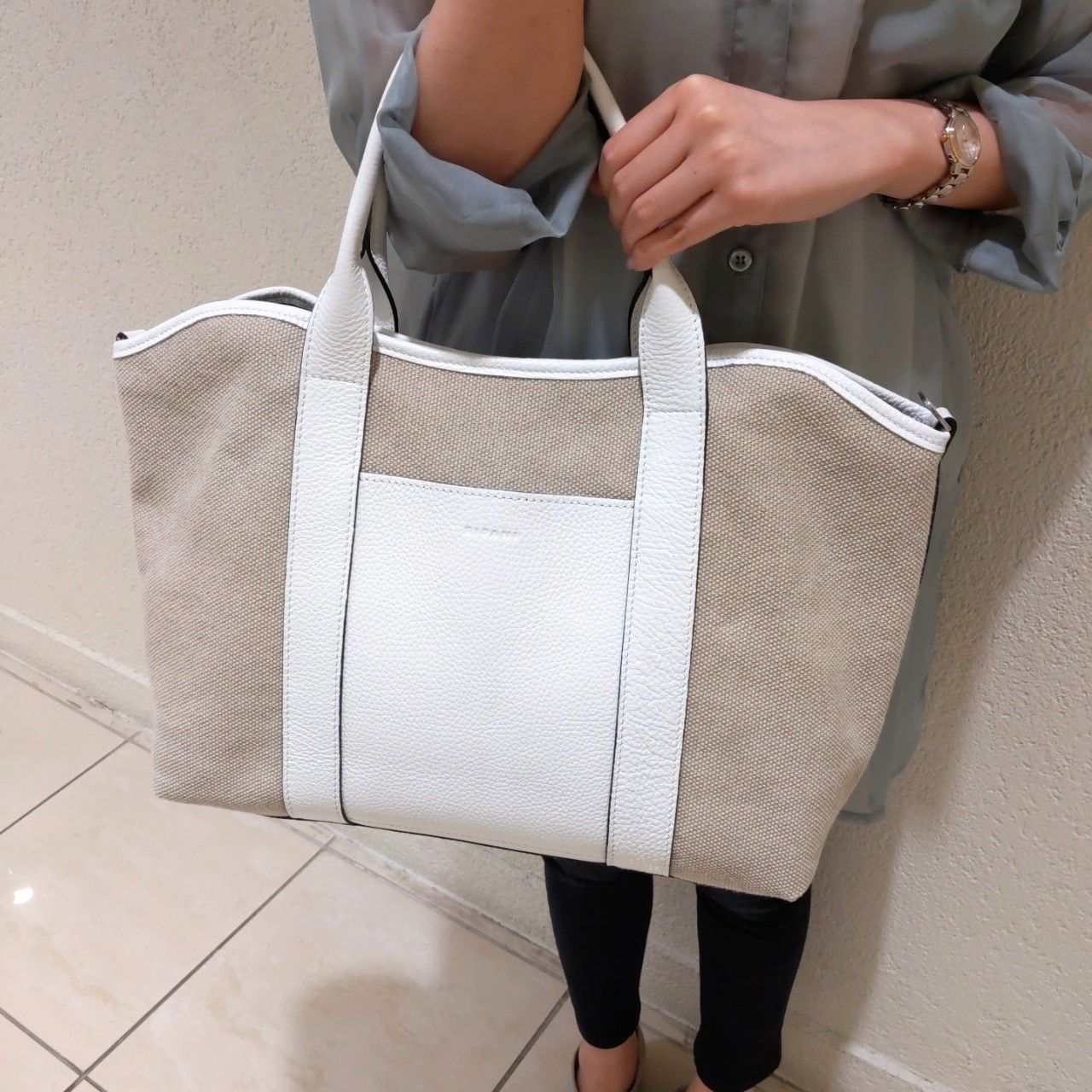 キャンバス×レザーのきれいめカジュアルなバッグです。