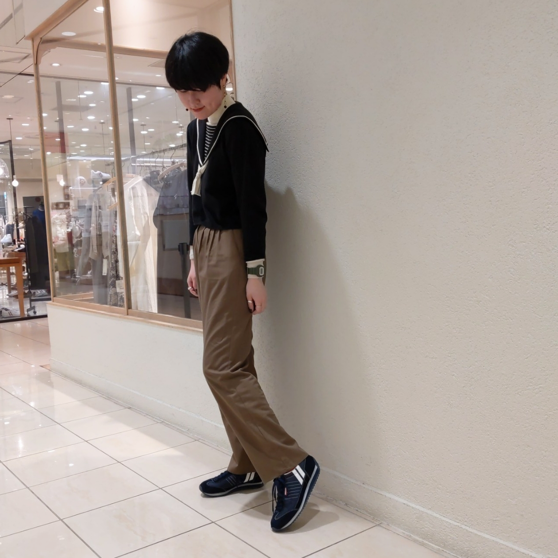 ゆるっとしたパンツですがネイビーが引き締めてくれるので、