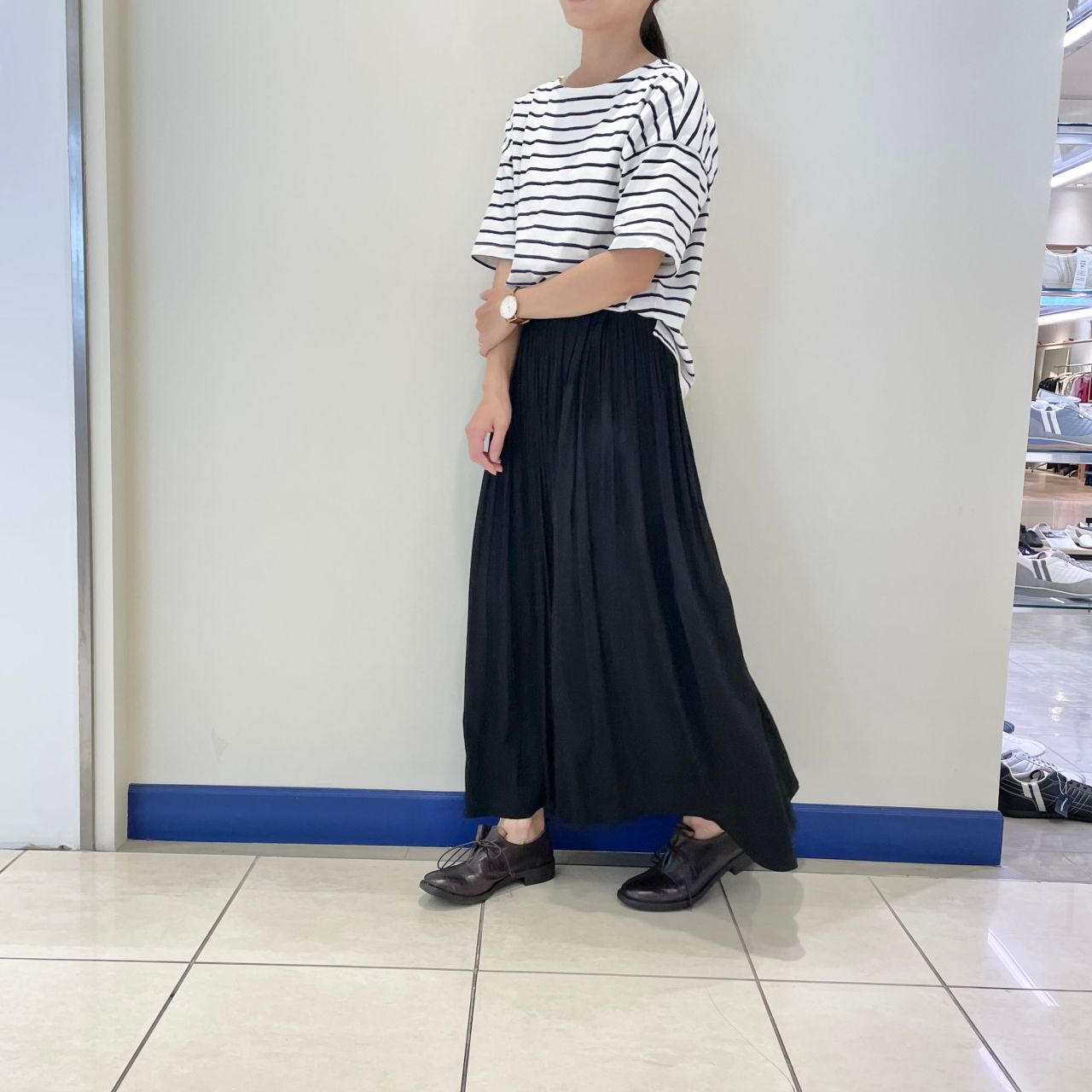 ちらっと見えるシューズとのコントラストが足元をおしゃれに演出してくれます。