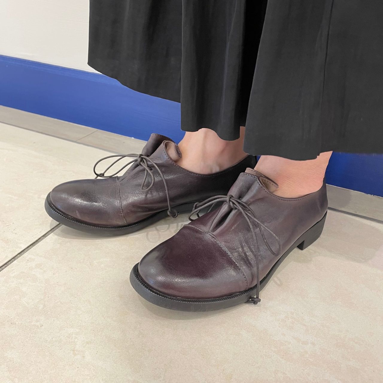 内踝周りがこちらのお靴の特徴なので、カラーソックスと合わせて足首を見せて頂くと、