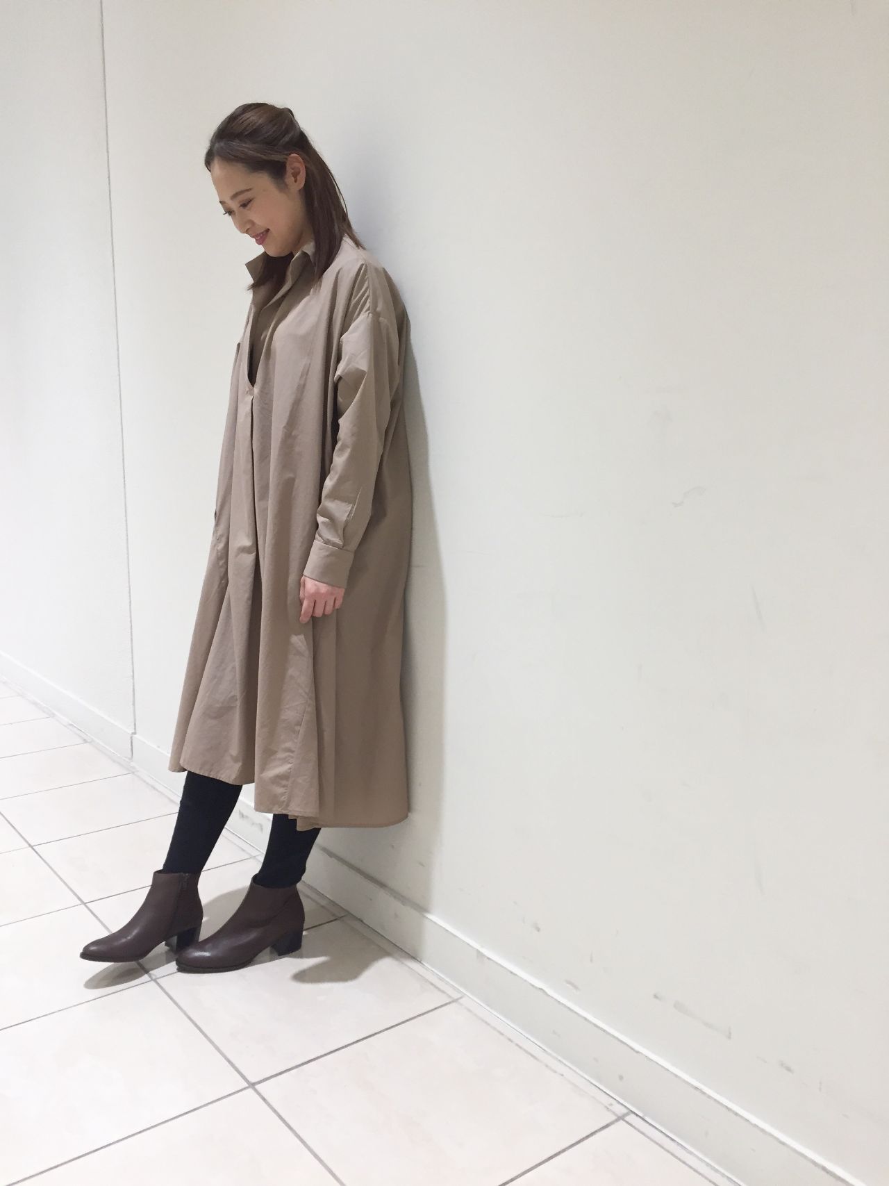 ワンピースとブーツをブラウンで合わせて、しっとりとした秋コーデに。