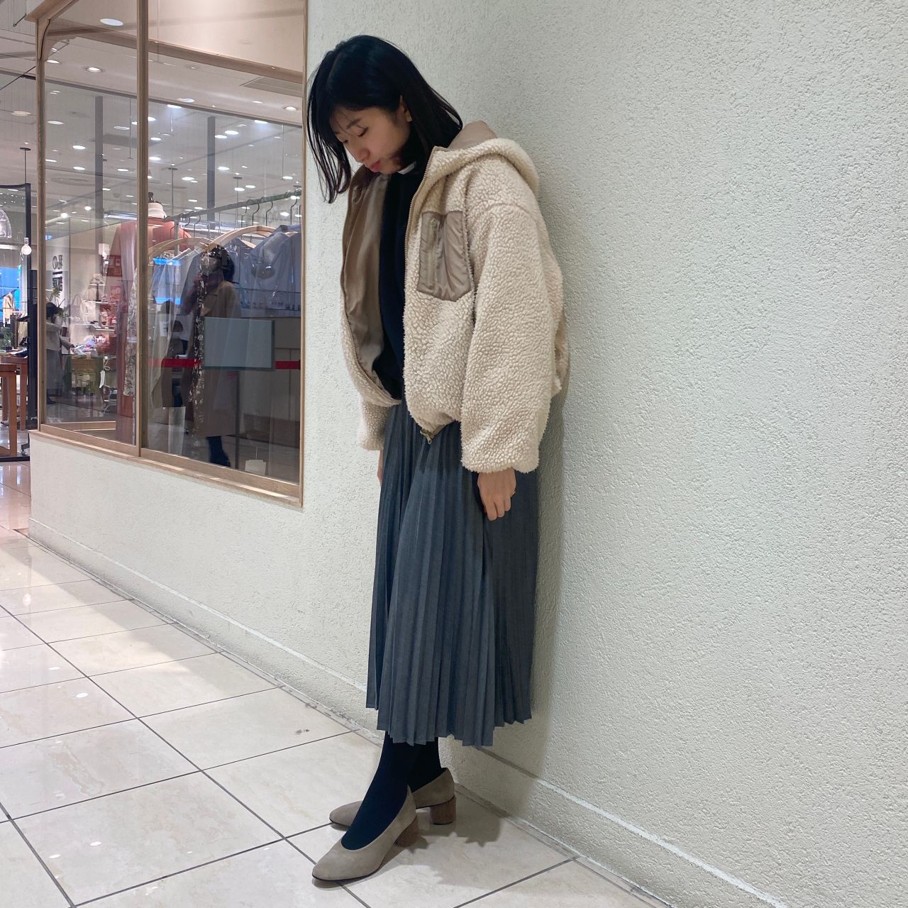 ブラックタイツと合わせてすっきりした印象に。