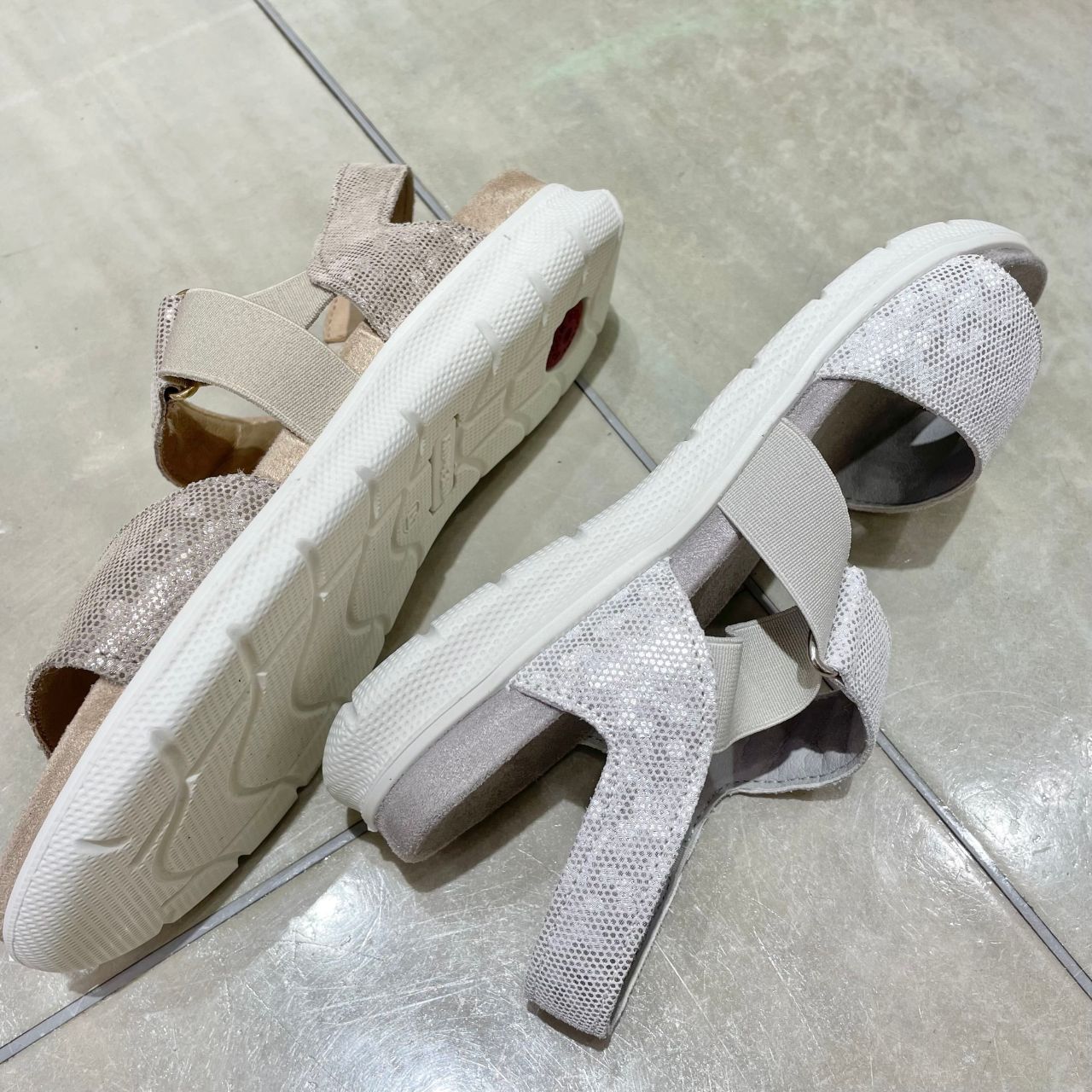 バックストラップと足の甲を包むベルトにはゴムも付いているので着脱もしやすく、