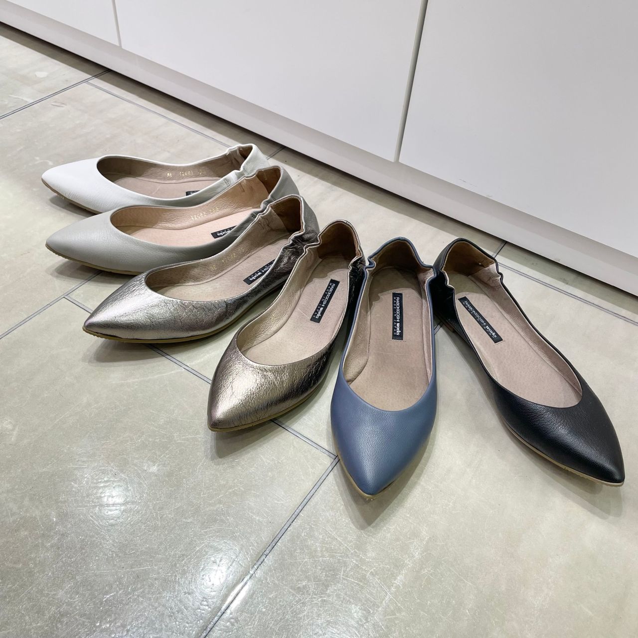 撥水レザーのポインテッドフラットシューズです。