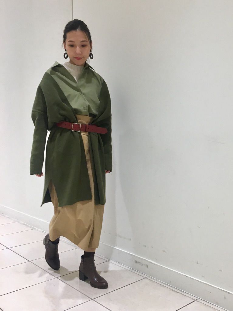 ベイクドカーキをブーツで引き締めたスタイリング。