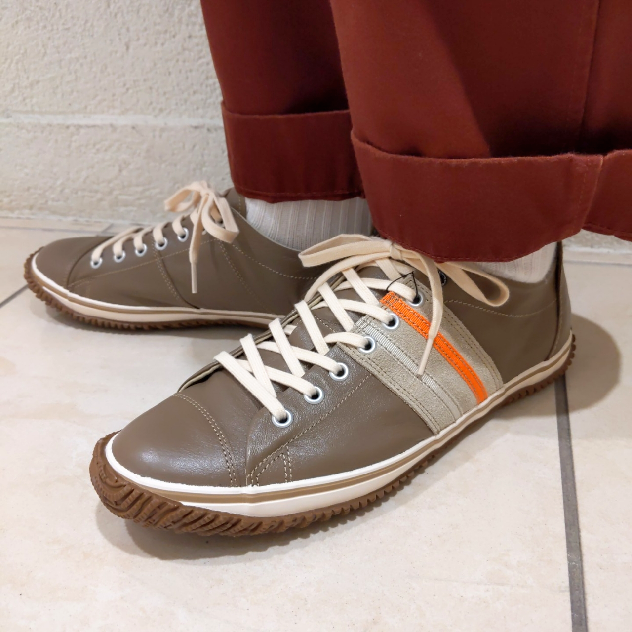落ち着いた色のアッパー・ソールにオレンジのラインがワンポイントになっています。