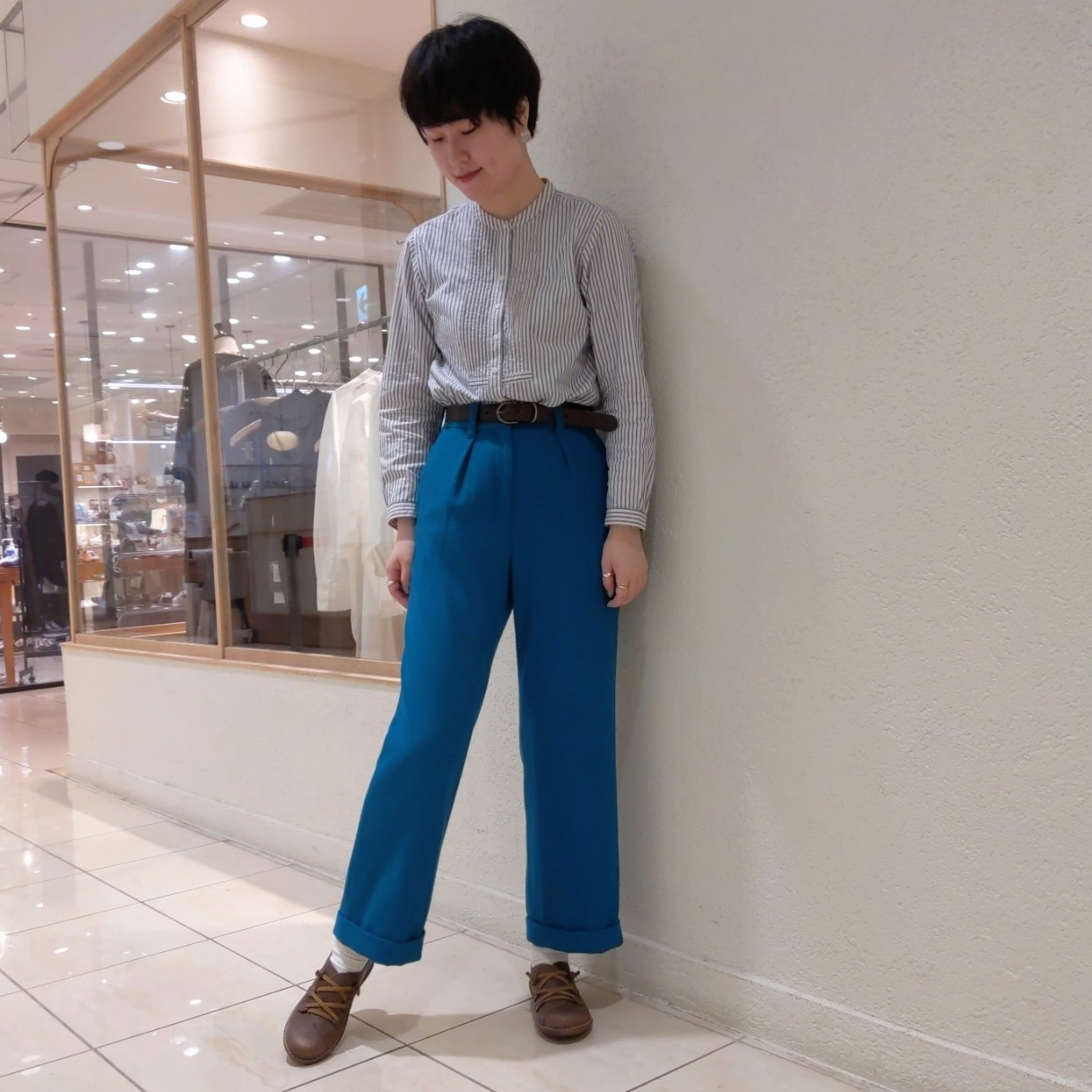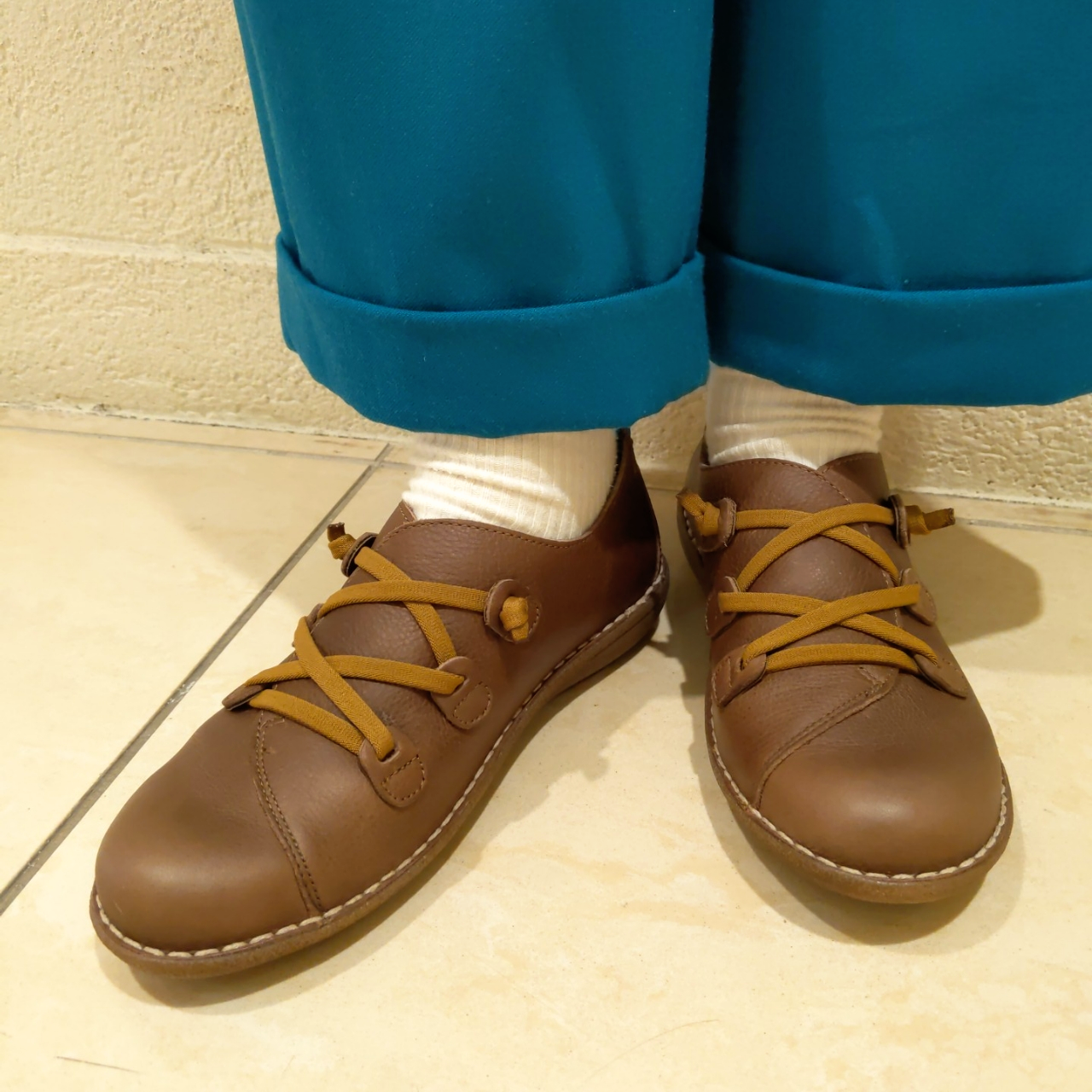 カラ―パンツと渋いブラウンが相性抜群!