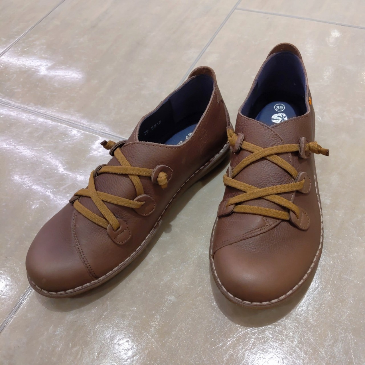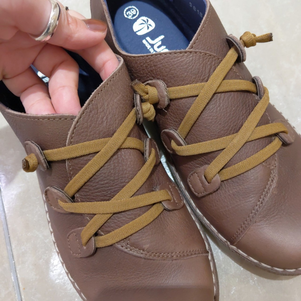 ブラウンのアッパーにベージュのステッチ・シューレースと