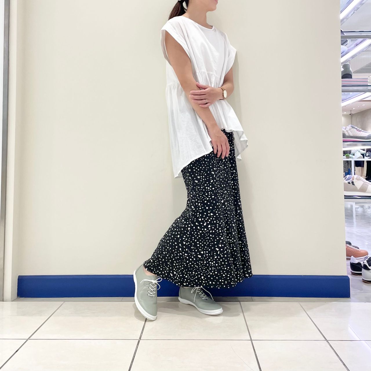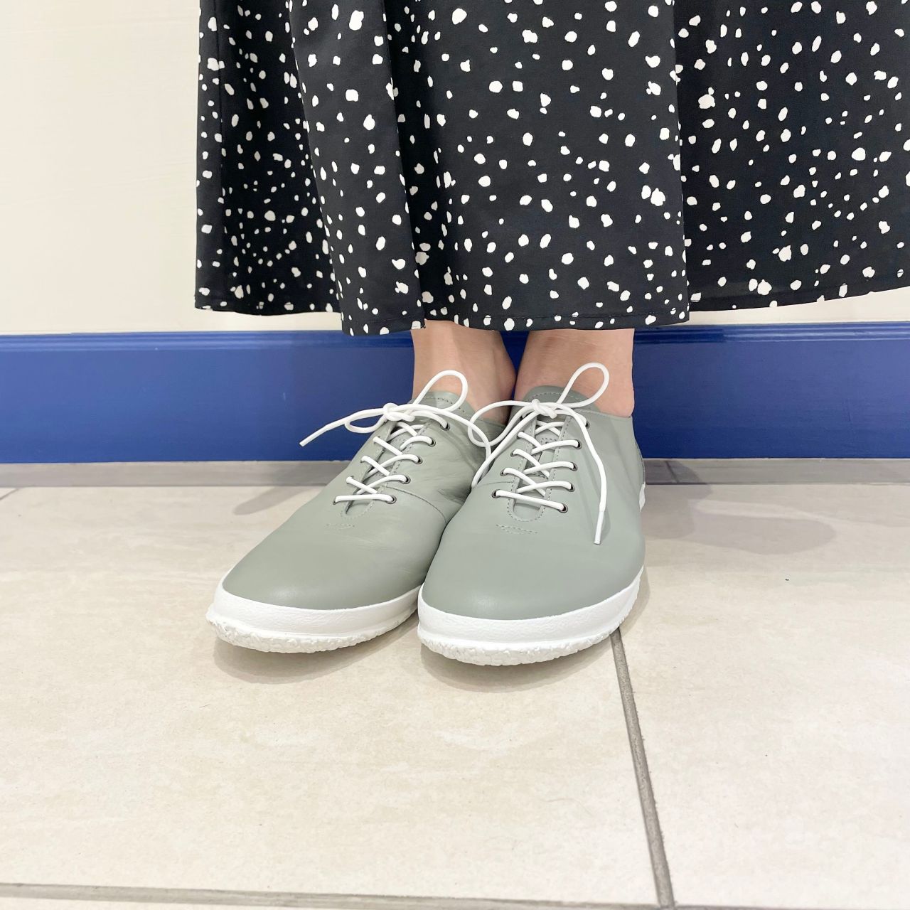 上品なくすみカラーで上品かつ、白のソールで足元を軽やかに