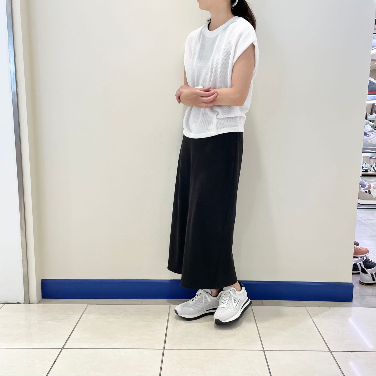 サイドのブランドロゴやソールのラインが足元を引き締め、