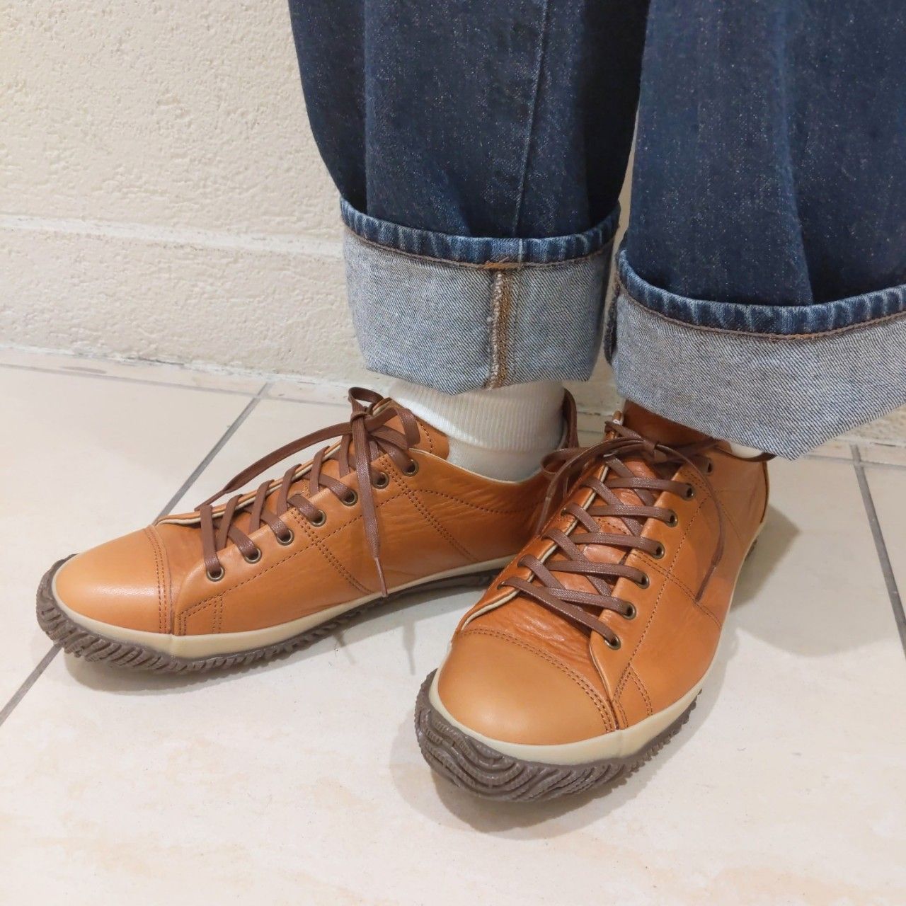 オイルワックスレザーを使用した上品なツヤ感があるスニーカーです。