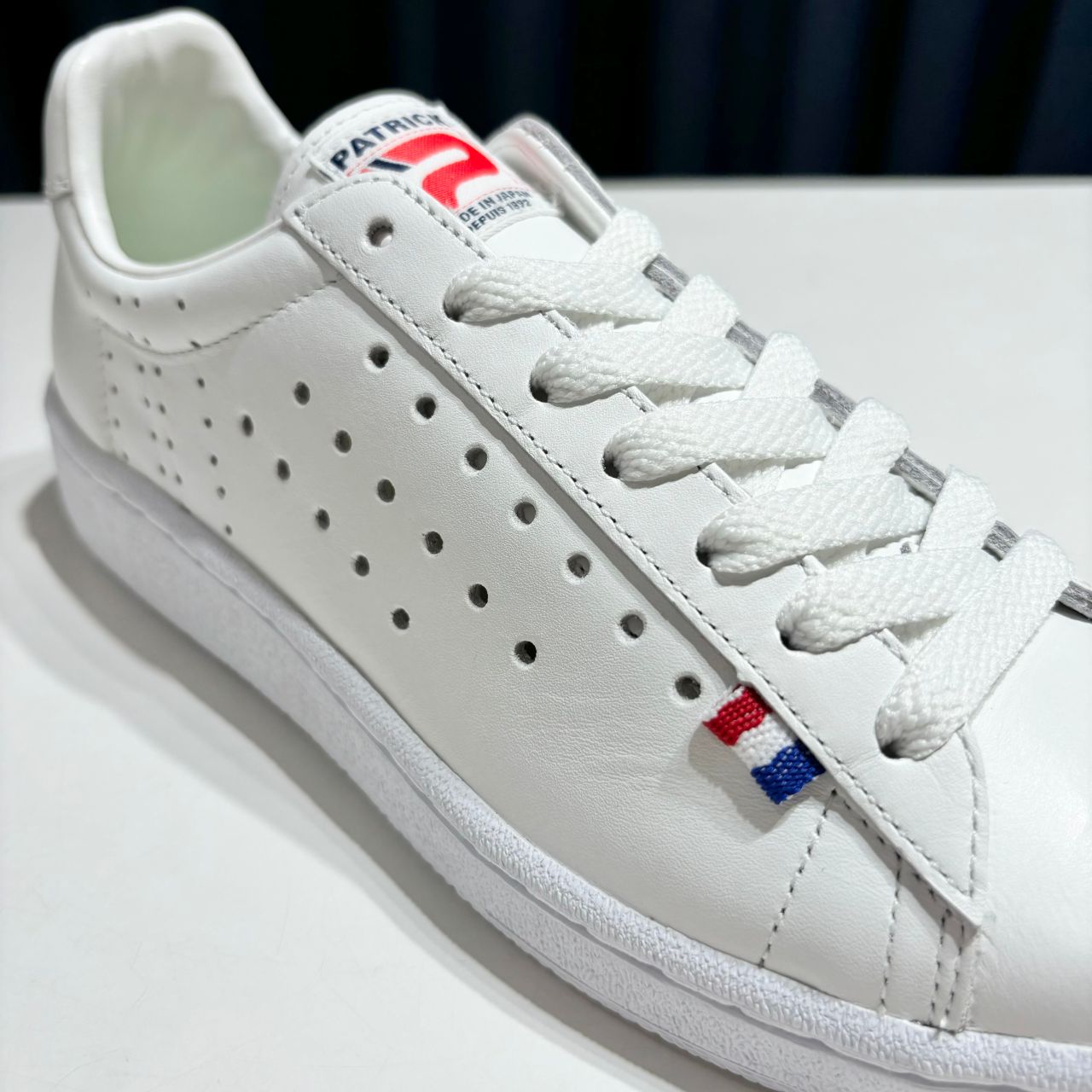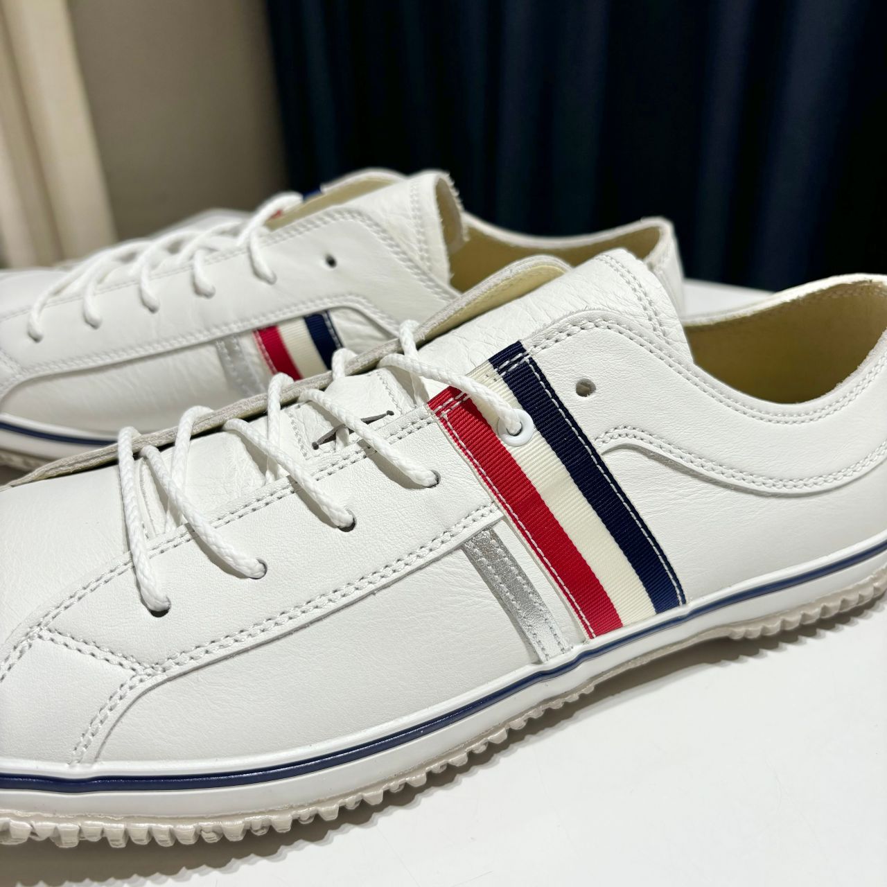 真っ白なアッパーにテープ部分のトリコロールが映えるデザイン!