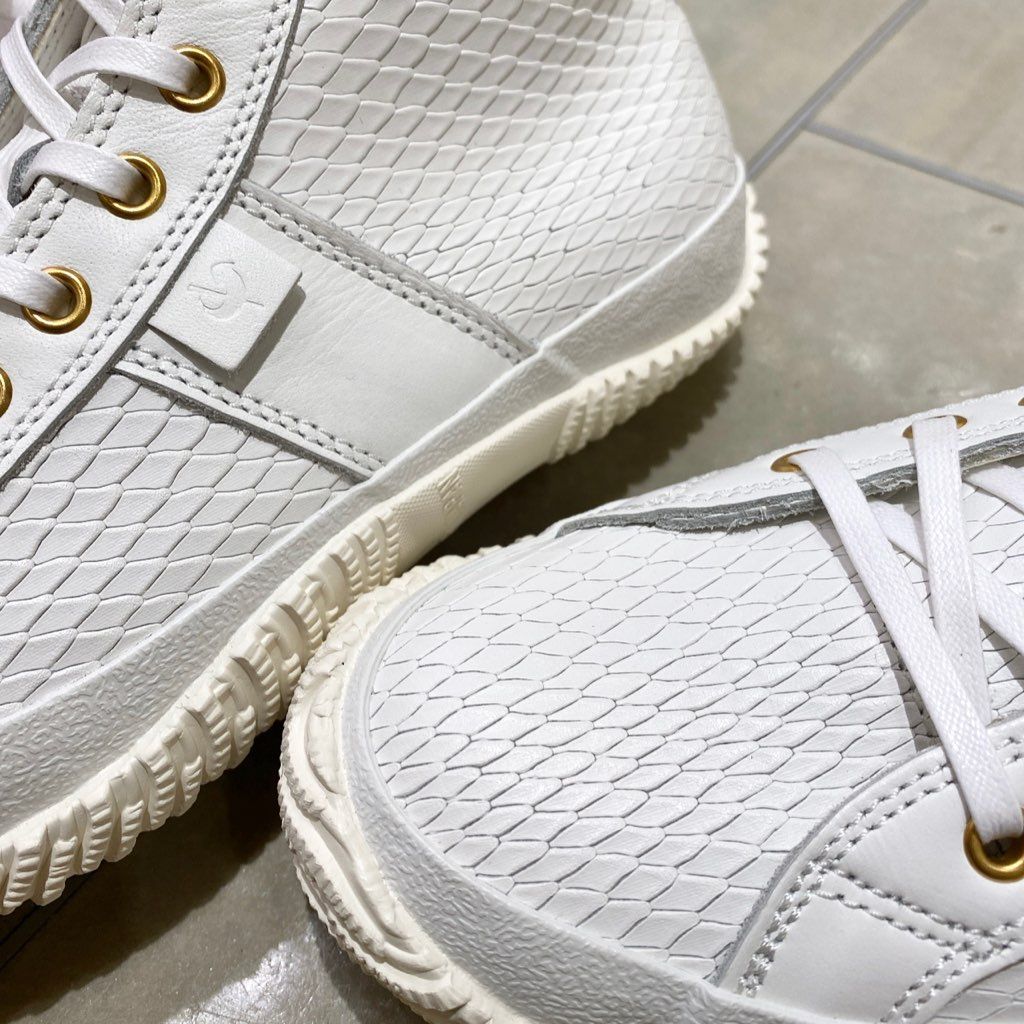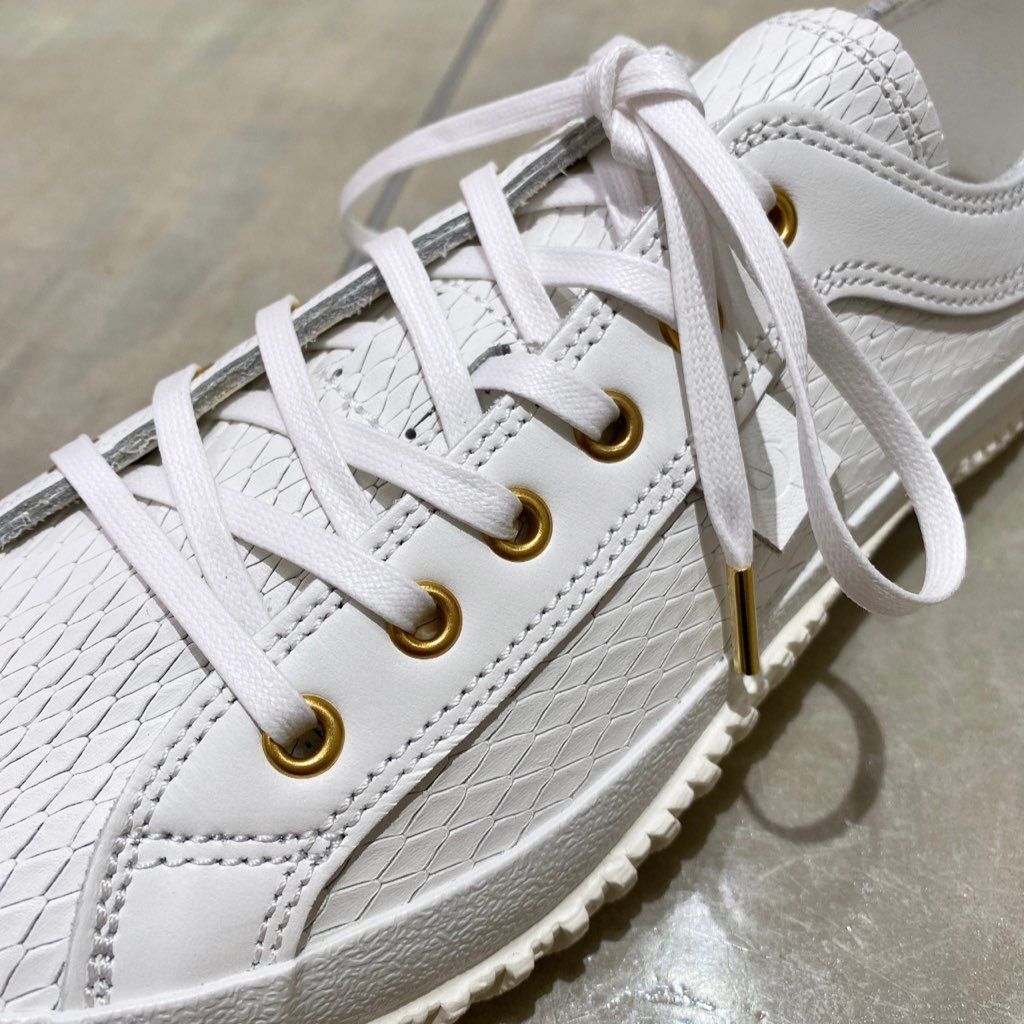 爽やかなホワイトの牛革に、スネークの型押しを施した1足。