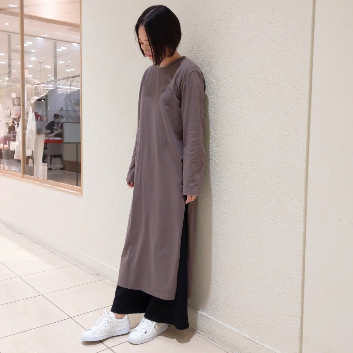 落ち着いた色味の洋服に足元のホワイトがアクセントに。