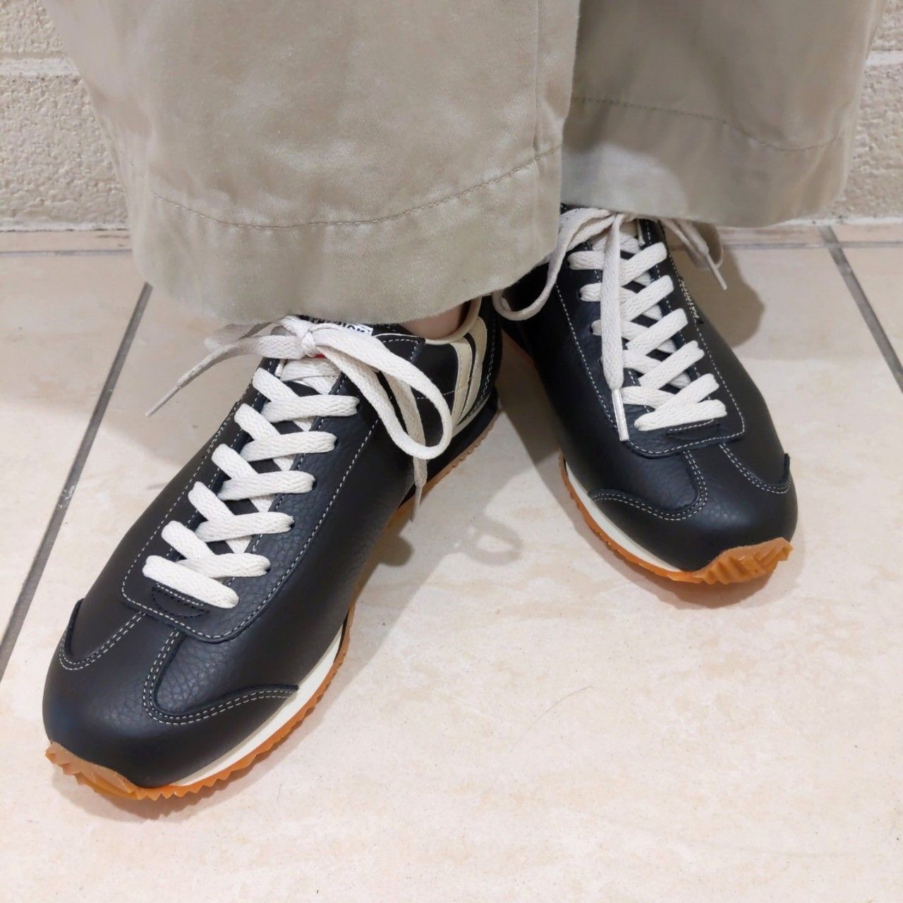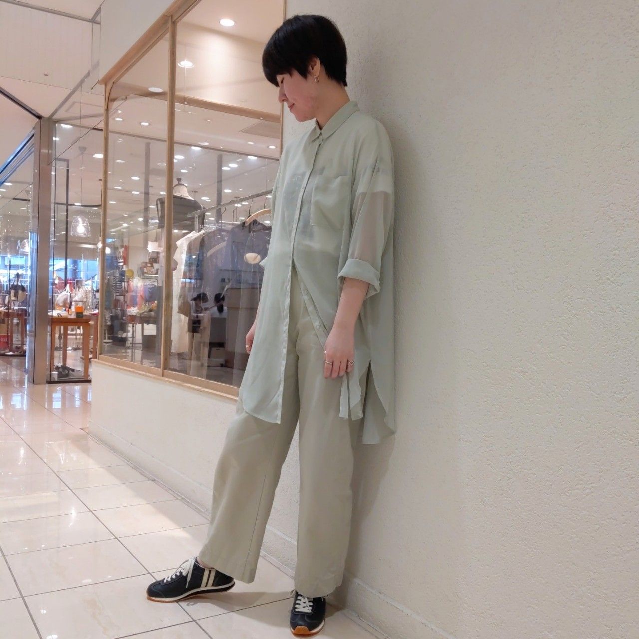 黒のスニーカーで淡い色のコーディネートにメリハリが出ます。