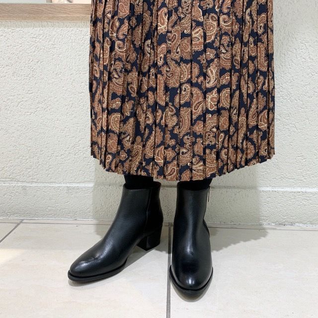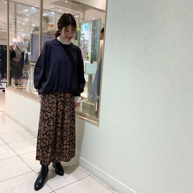 ペイズリー柄のプリーツスカートと合わせてクラシカルに…。