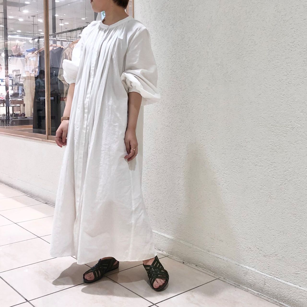 シンプルな真っ白のワンピースに、差し色でKAKIを合わせてみました。