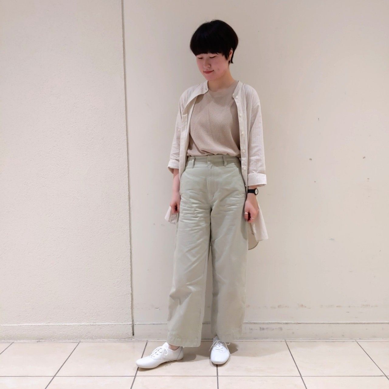 ボリュームのあるパンツとスニーカーが相性抜群です。