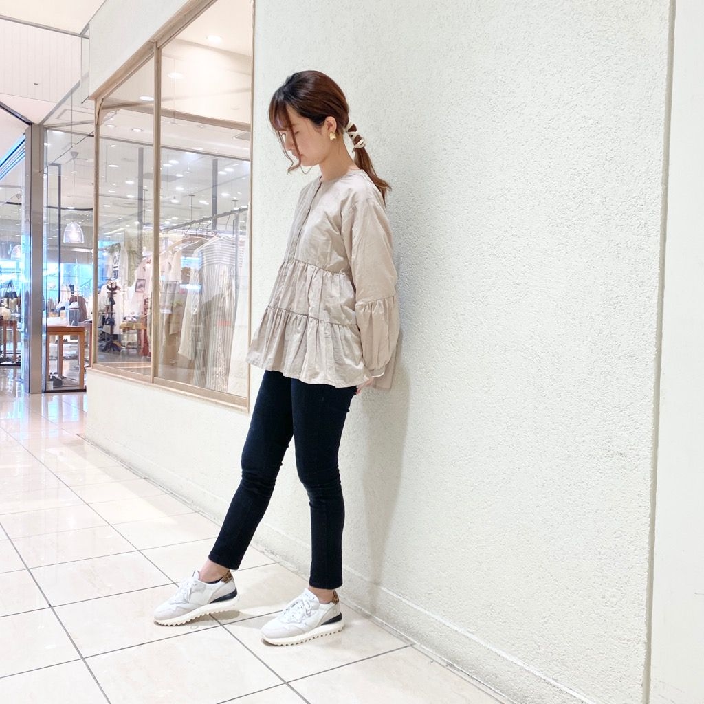 ボリュームソールが映えるように、細身のパンツで合わせてみました。