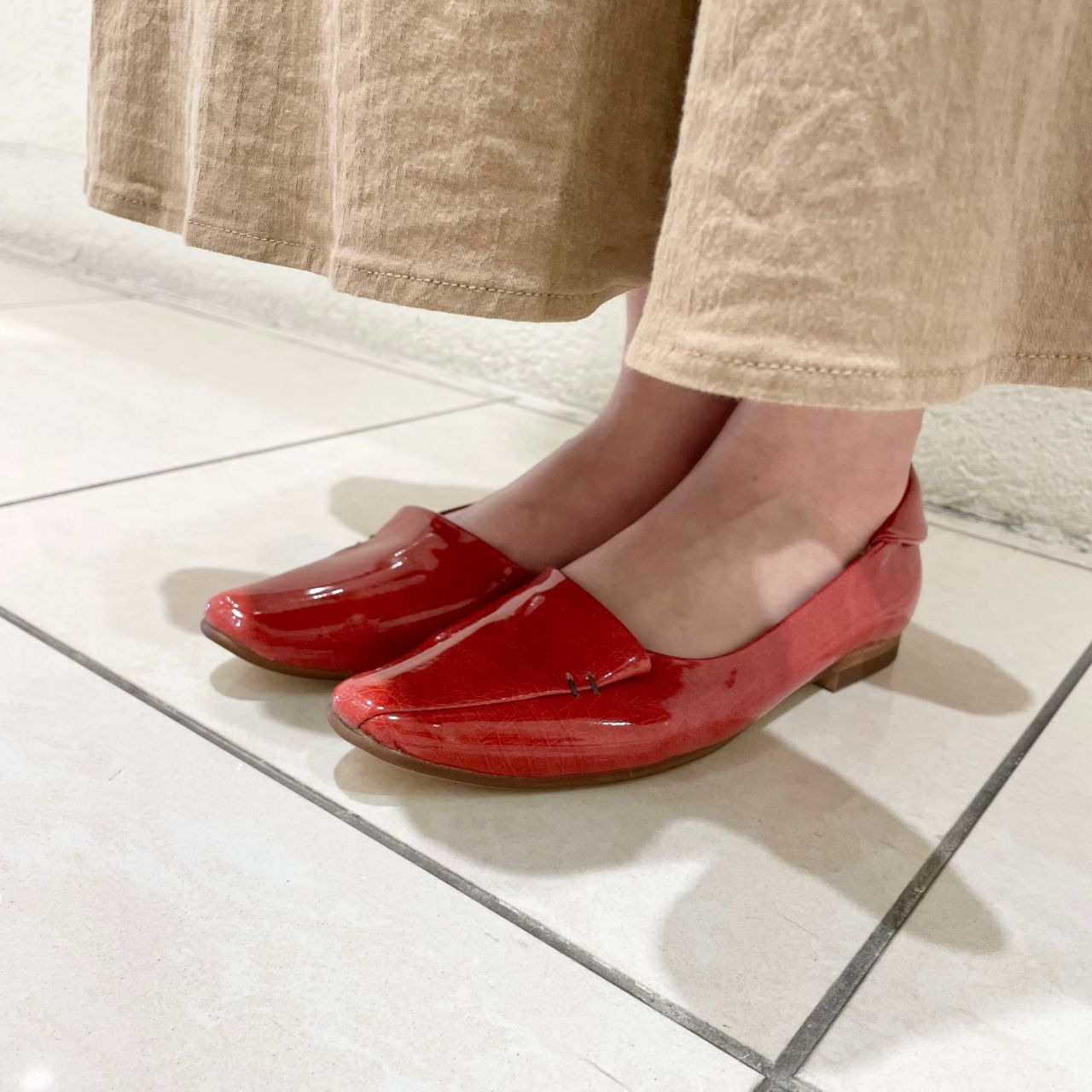 例えば白シャツに黒パンツ、トレンチコートを羽織って、足元はこちらのレンガエナメルを合わせるだけでシンプルなコーディネートがぐっと華やぎますよ!