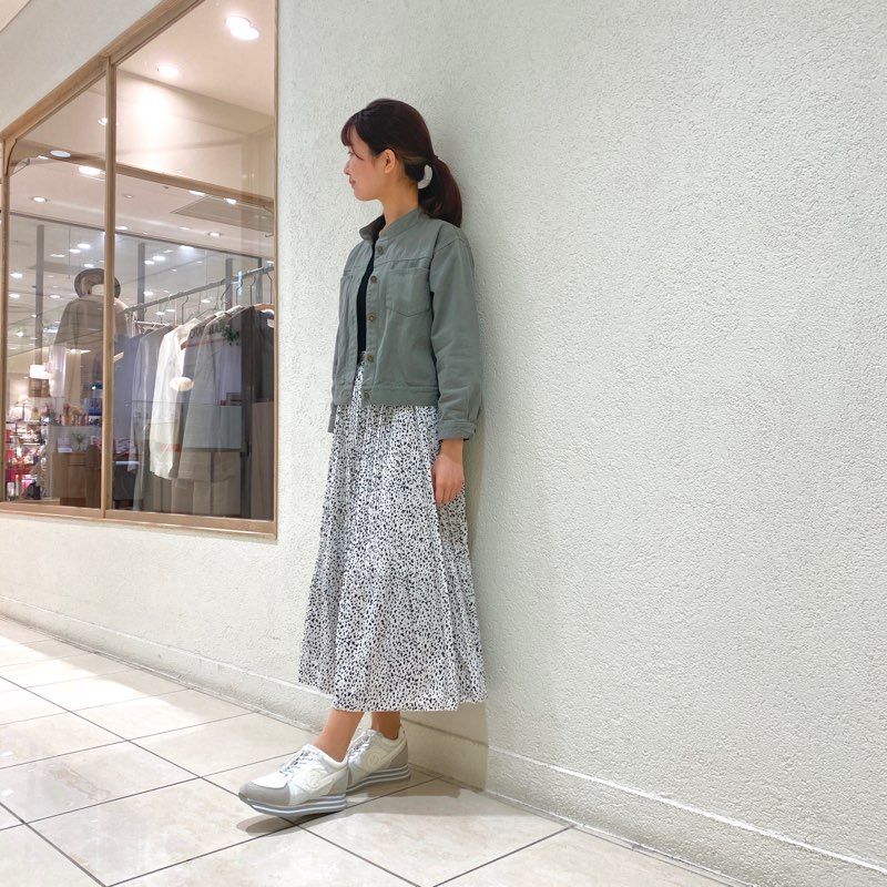 ホワイトの総柄スカートのスタイリングで合わせてみました。