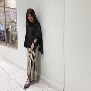 ダークブラウンのゆるトップスに、秋を意識したマルチカラーのタイトスカートで。