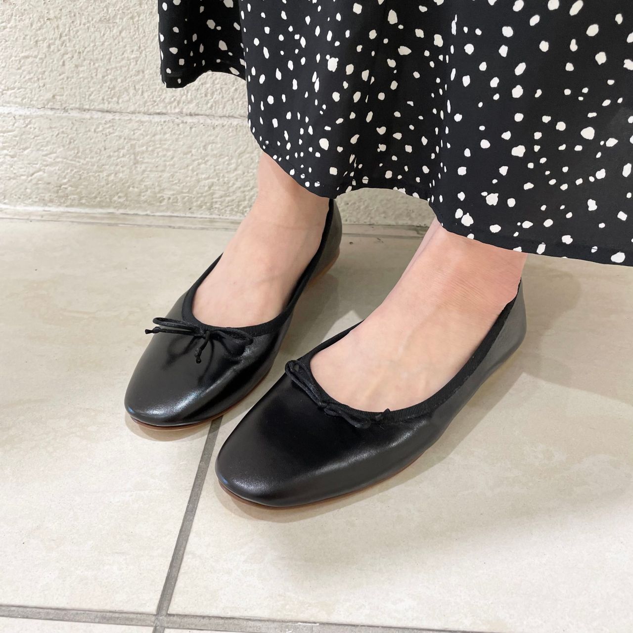 レザーの質感に合わせてバレエシューズでフェミニンに…