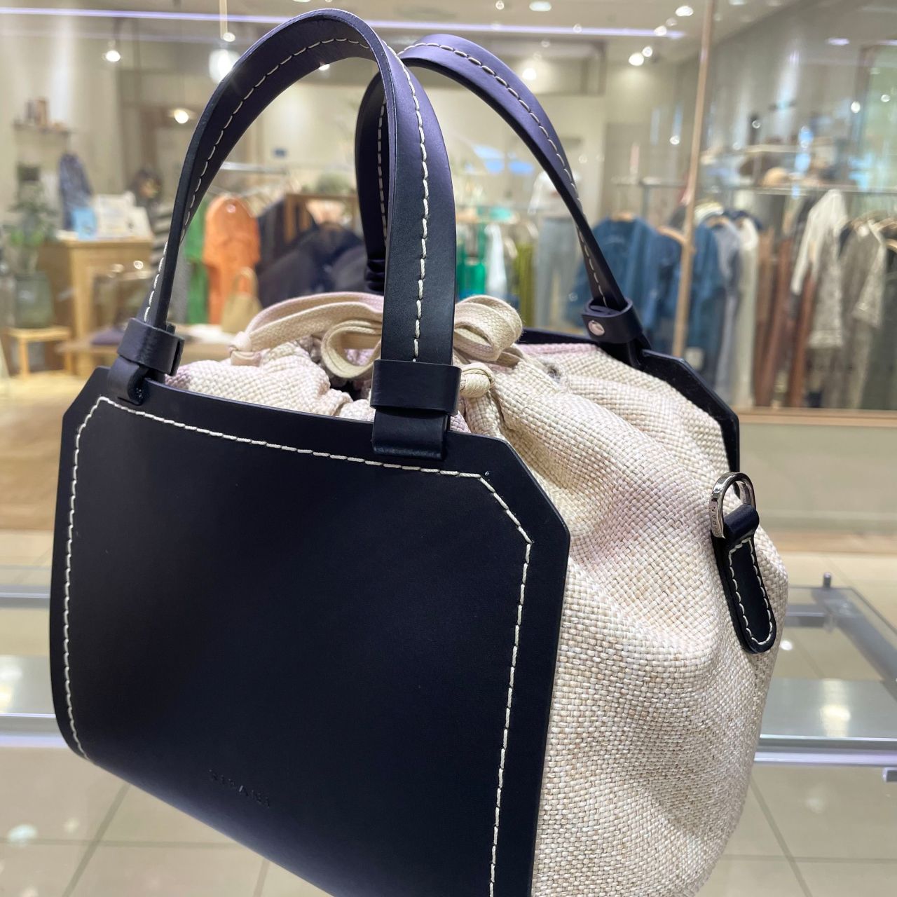 モダンな雰囲気が印象的なキャンバス地とレザーのコンビネーションバッグ。