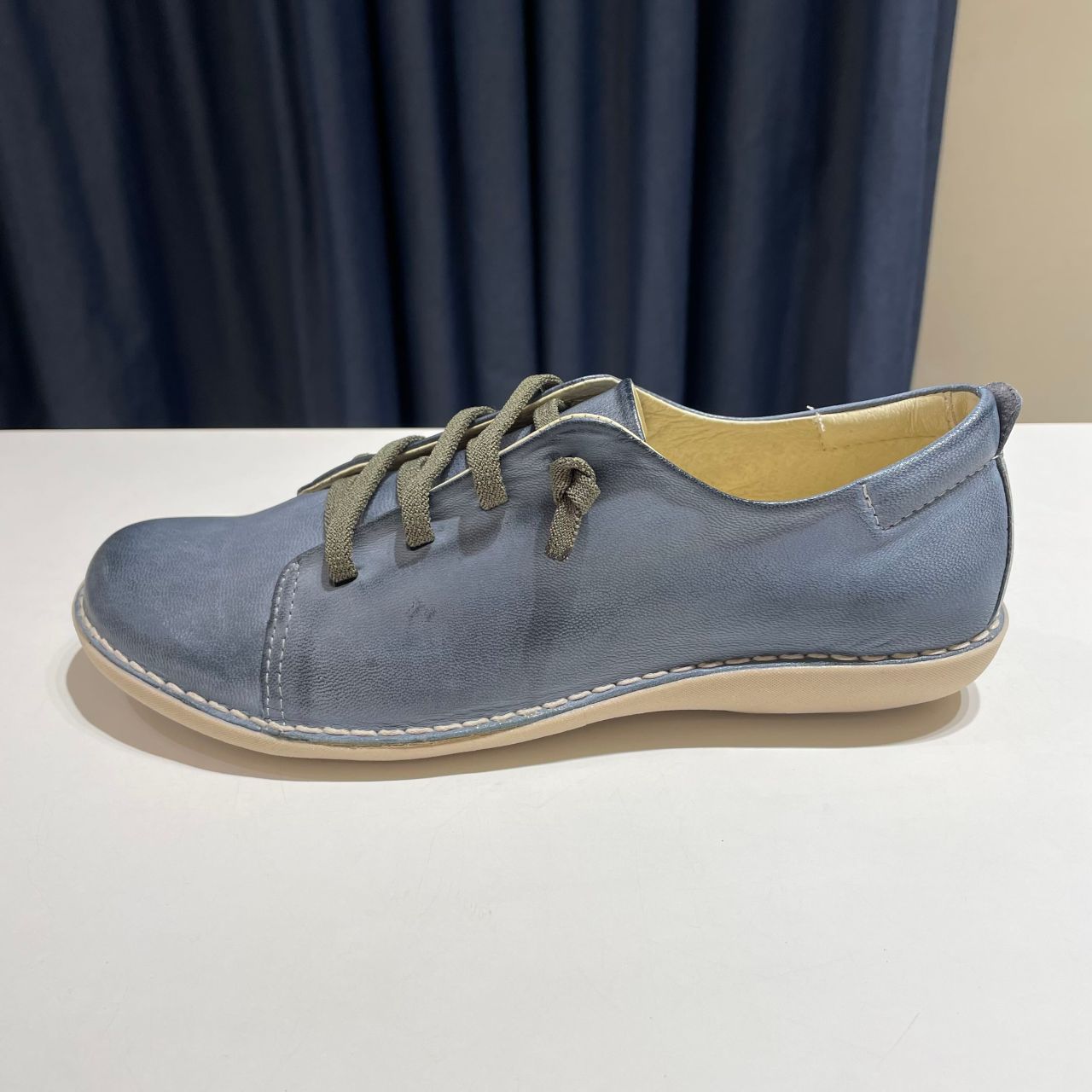 マットなブルーではなく上品な革の風合いを残した優しいブルーです。