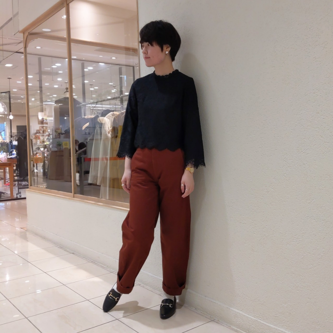 レースのトップスに足元はローファーを合わせて