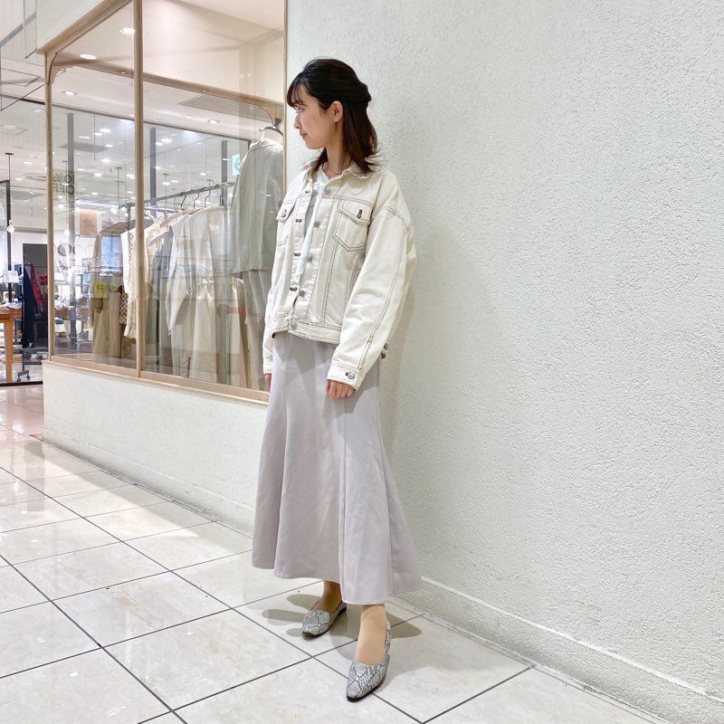 春らしいラベンダーカラーのスカートの足元に、グレージュスネークを合わせてみました。
