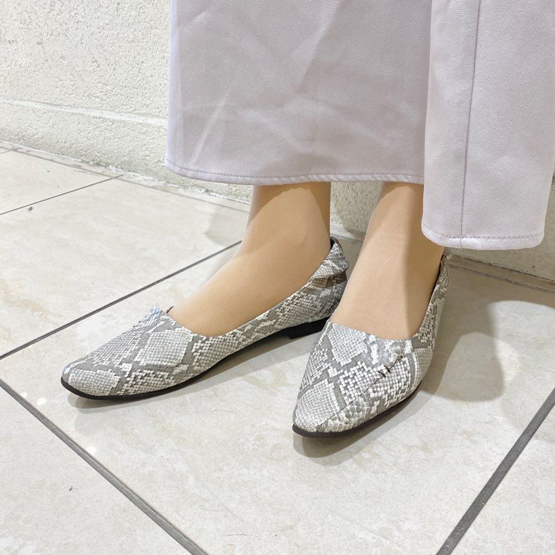 お洋服を淡い色合いで重ねても、スネーク柄の高級感が大人らしく仕上げてくれます。