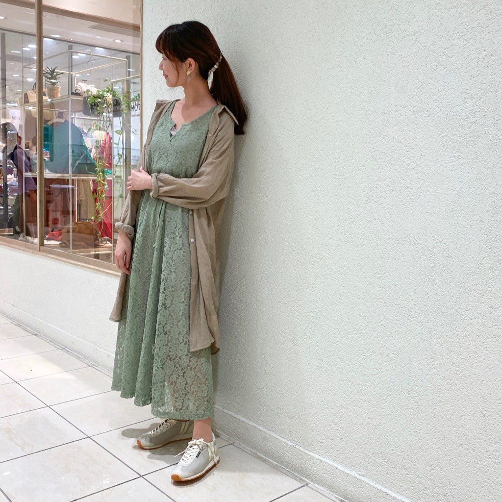 透け感のあるワンピースにリネンスニーカーで爽やかなスタイリングに。