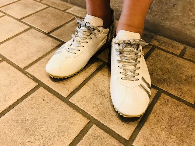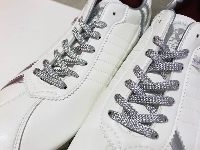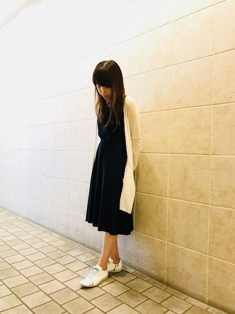 シルバーのシューレースがカジュアルさを減らして、スカートスタイルにも◎
