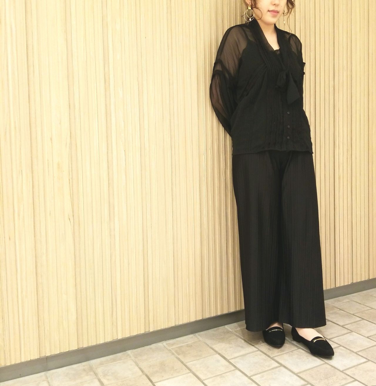 オールブラックのコーディネートで少し重たい雰囲気がありますが、足もとをシャープなポインテッドトゥのデザインでメリハリを持たせてシックなスタイルにまとめてみました。