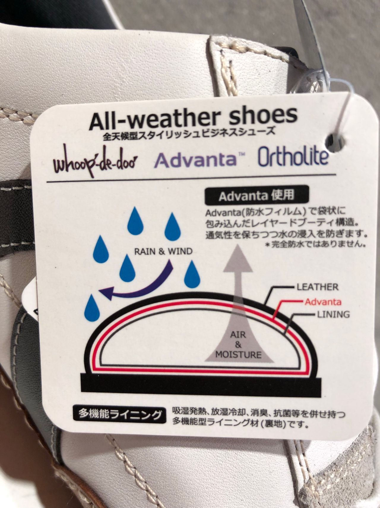 こちらはレザーですが、Advantaという防水フィルムを使用。通気性を保ちつつ浸水を防ぎます。※完全防水ではございません。