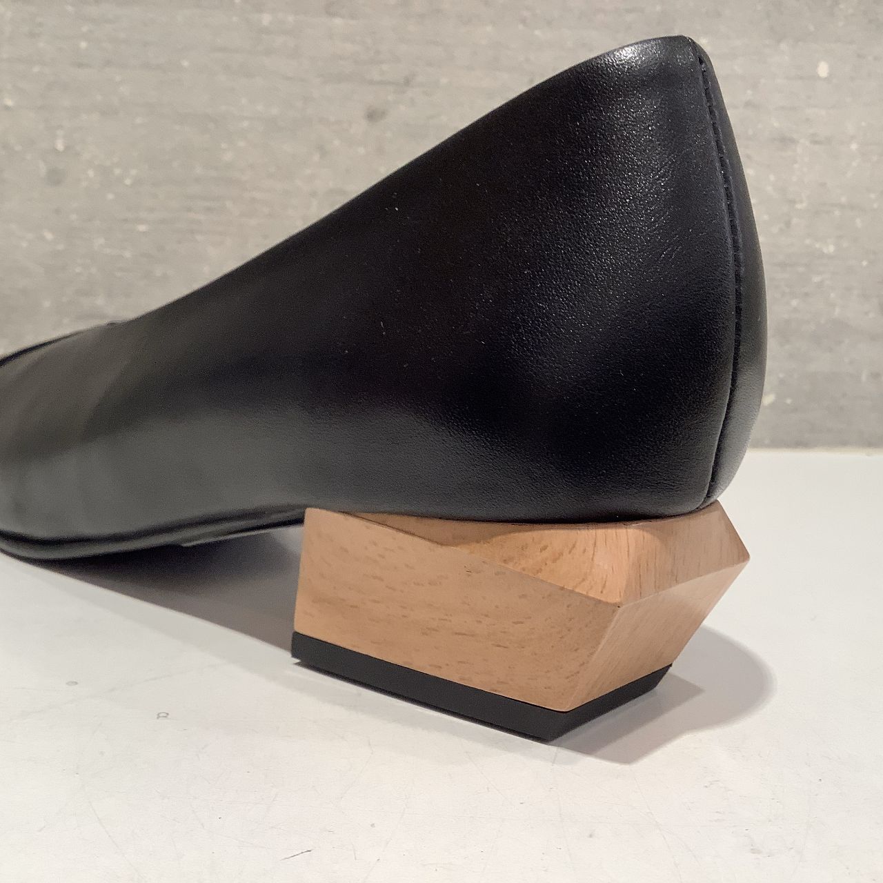 フェイクウッドのブロックヒールの存在感とスクエアトゥが足元のアクセントに。