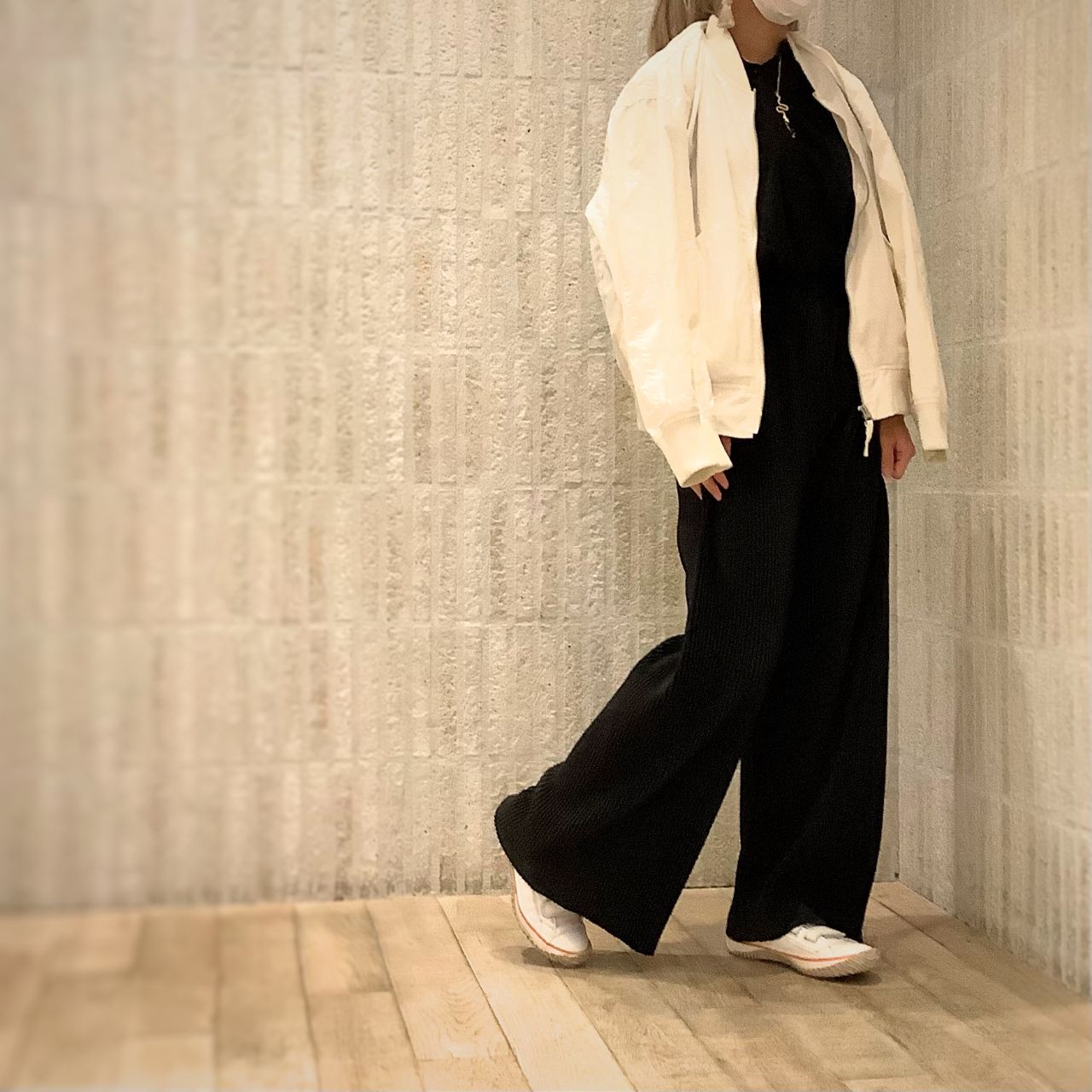 洋服はブラック、小物はホワイトのモノクロコーデ。