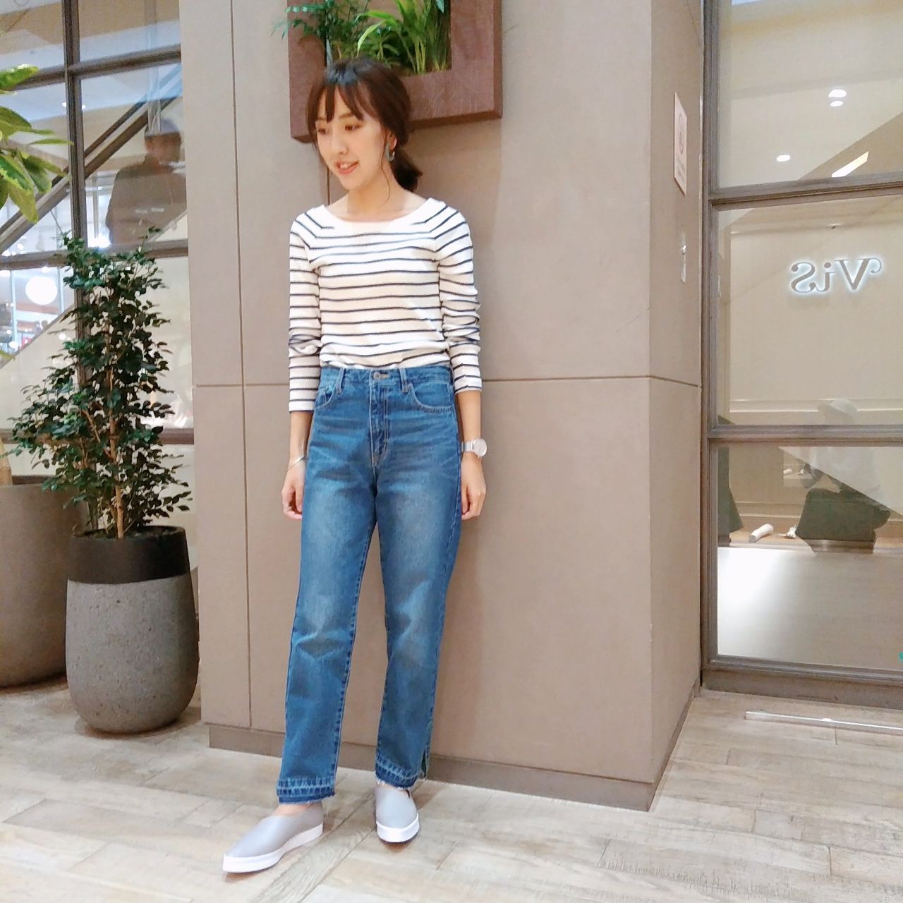 小技の効いたデニムとスリッポンスニーカーで