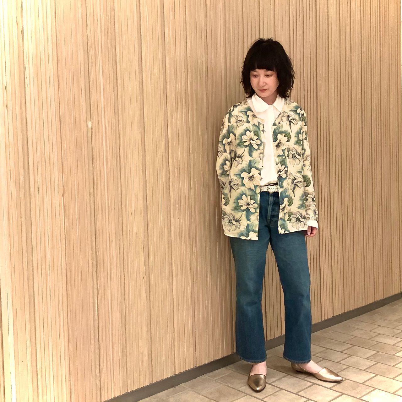 花柄トップスと合わせてより華やかなスタイルに。