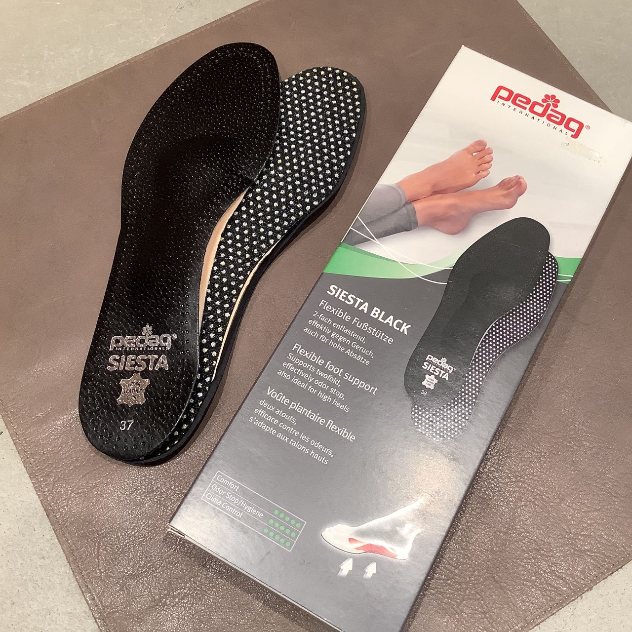 オススメのインソールはペダックのシエスタ!レザーなので脱いだ時もおしゃれなんです!↓