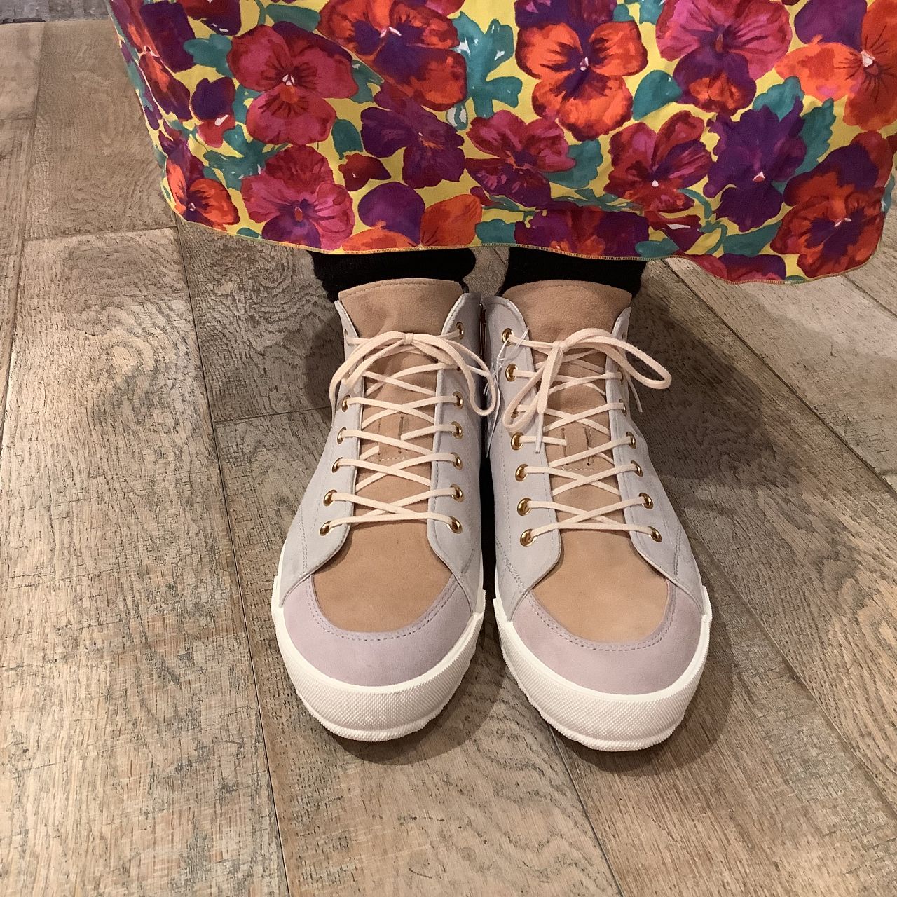 ベージュを基調にしたミドルカットで、爽やかで優しい雰囲気が出る一足!