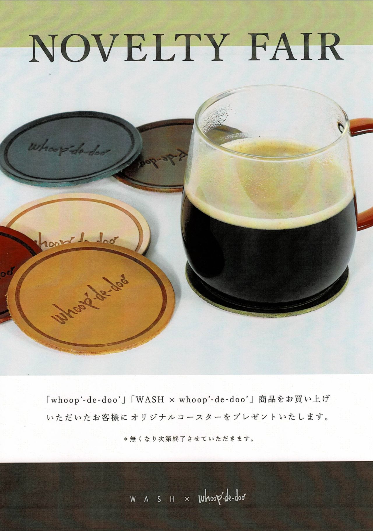 whoop'-de-doo'の商品をお買い上げの方に、オリジナルレザーコースターをプレゼント!