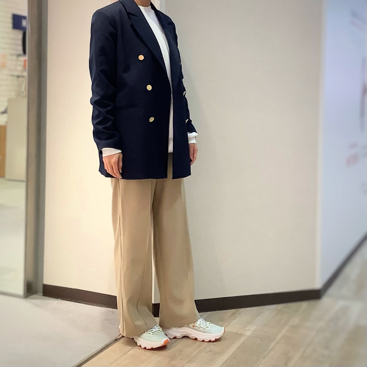 紺ブレザーにベージュのワイドパンツで合わせて、カジュアルな雰囲気に。