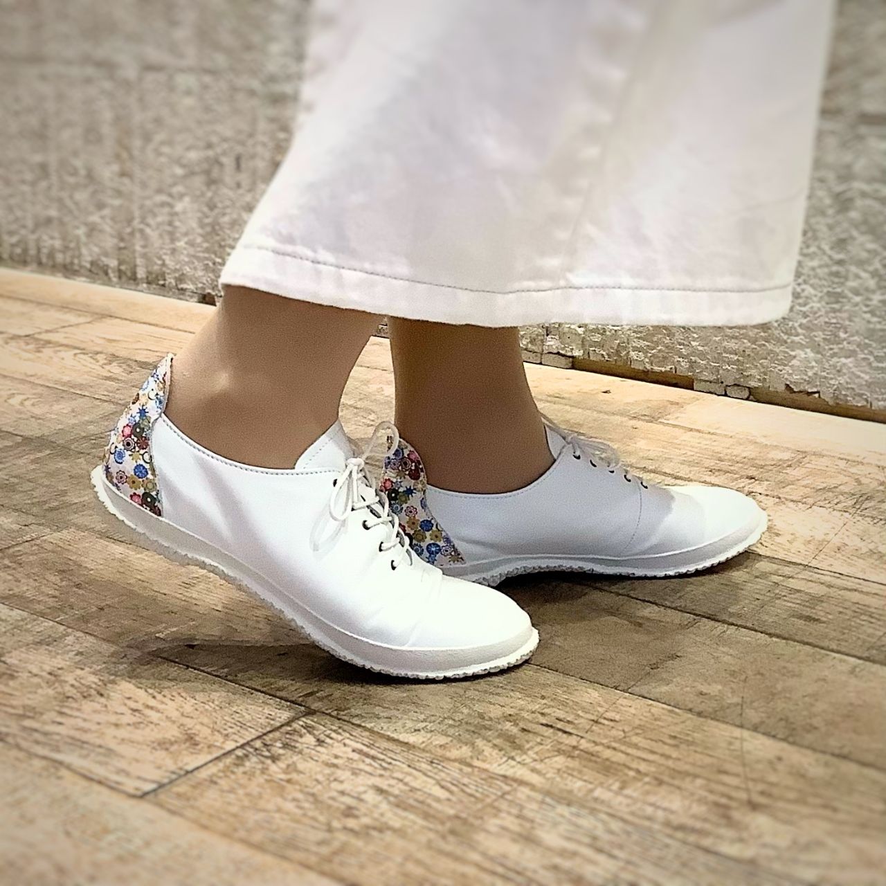 今回のシューズは新しいロゴがオリジナルのフラワーパターンにランダムに散りばめられたプリントレザーを使用したモデルとなります。