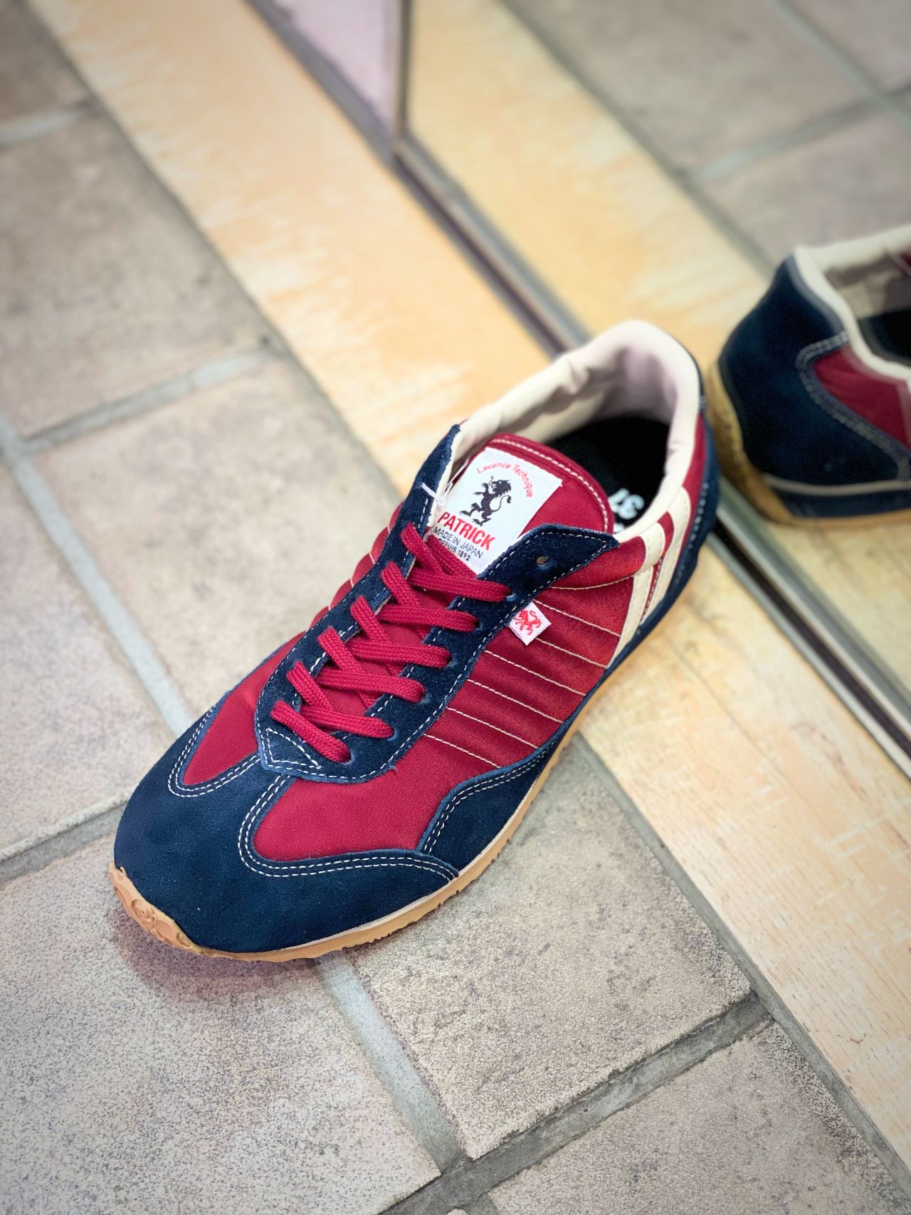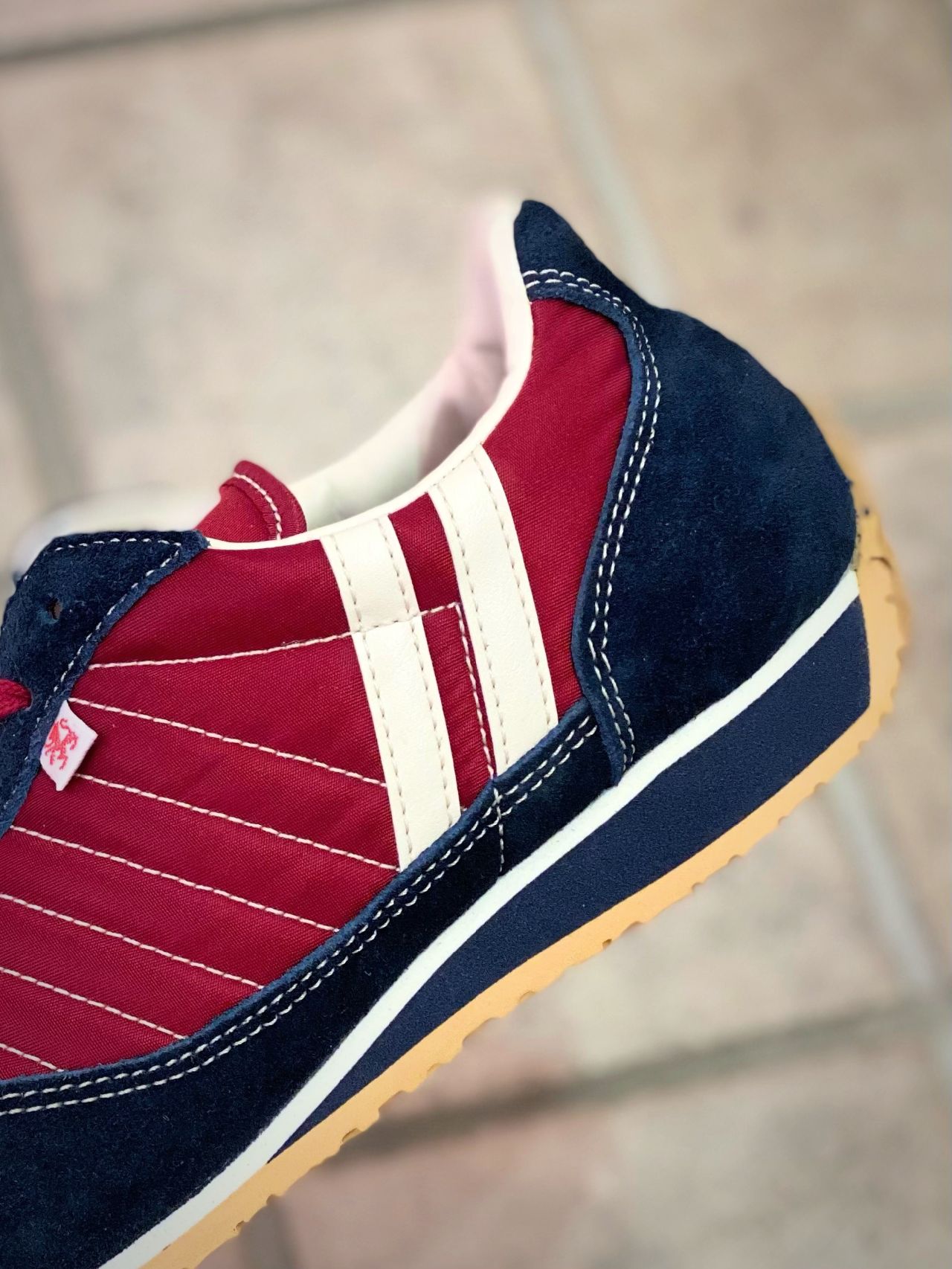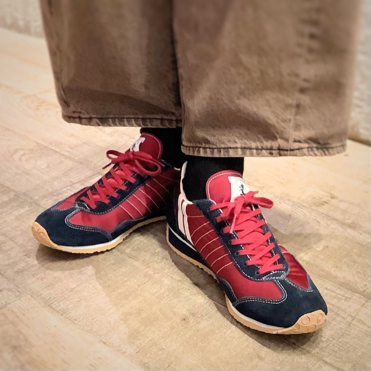 ナイロン部分は深みのあるボルドー、爪先のスエード部分はネイビー。