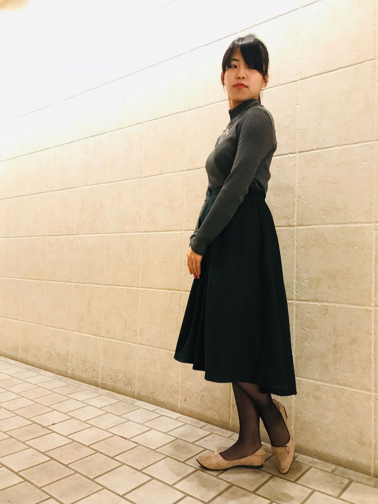 フレアスカート×透け感のあるブラックタイツに合わせて。