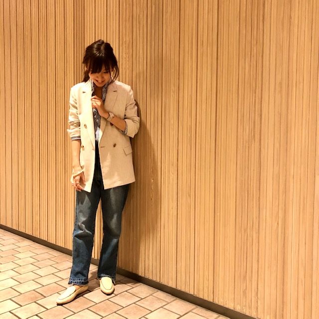 ベージュ×ブルーの爽やかコーデに。