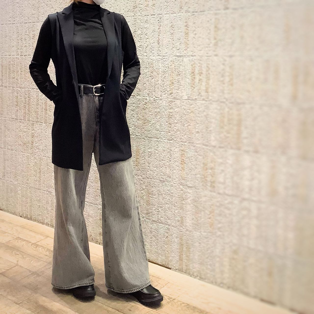 ワイドデニムに合わせて、足元ボリューム。